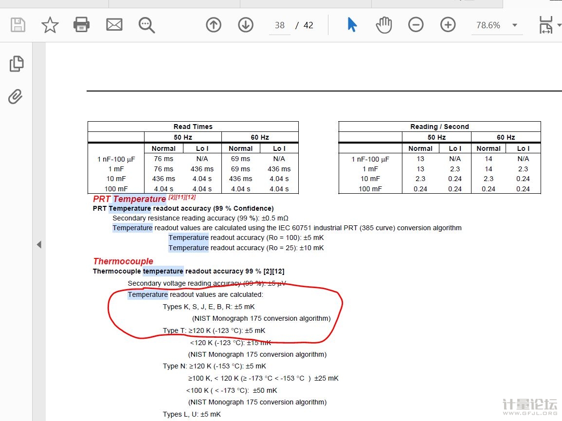 逾距之刀 發表于 2023-6-15 09:46 這個說明書寫的這么清楚,不知道你那里不明白,然后一直糾結5mK換算成熱電偶溫度是多少,K不就是溫度單位嗎???mK不就是詞頭和溫度單位的組合嗎???T(℃)=t(K)+273.15,你直接換算不就好了嗎,都是一樣的10進制單位,就單位換算一下不就好了嗎,你這里表示允許誤差,就相當于℃=K(因為是允許誤差,加273.15沒有意義),這里的5mK就直接換成0.005℃,就是變成℃單位了,他是熱電偶溫度不也是輸出的℃單位(或者通過電阻或電勢換算成溫度單位)?就不知道你糾結啥,多看書,其實書上啥都有。圖片你自己畫圈的地方都給你寫明白了,用開爾文表示的時候是大于120開爾文,用攝氏度表示的時候是大于-123攝氏度,允許誤差都是正負5mK(0.005℃)。 |