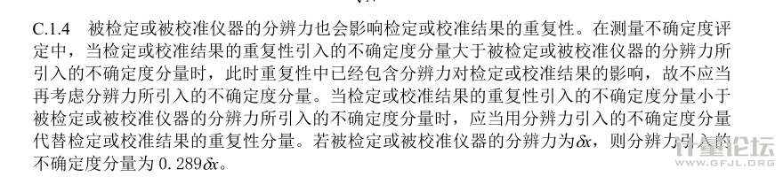 | 分辨力取半寬即1/2,再按照均勻分布除根號3,可不是0.289嗎。另外分辨力需要考慮實際讀數的,比如某顯示儀表顯示到0.1位(分辨率),實際可能是0.5(能分辨的能力)的倍數跳動,那么分辨力就按0.5計算而不是0.1,還有模擬儀表分度值是0.1,規程規定按照1/5估讀,那么分辨力(即肉眼或借助放大鏡之類設備后的分辨能力)引入不確定度就是估讀誤差引入不確定度0.289*0.1*1/5=0.02 |