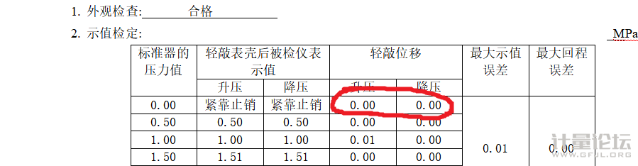 1.示值誤差是取“輕敲后被檢表的示值“與標準器的示值之差。 2.規(guī)程“輕敲前、后被檢壓力表表示值與標準器示值之差即為該檢定點的示值誤差”這句話是有誤的,2024年在修訂JJG52征求意見稿中,已經(jīng)去掉了“輕敲前”。 |