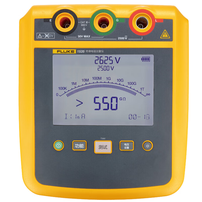 絕緣測試電壓精度:-0%,在 1 mA 負載電流下 + 10%;電容負載充電速率:5 s/μF;電容負載放電速率:1.5 s/μF | | 量程 | 精度 | | 漏電流測量 | 1 nA 至 2 mA | ±(20% + 2 nA) | | 電容測量 | 0.01 μF 至 2.00 μF | ±(15% rdg + 0.03 μF) | | 絕緣電阻測試電壓 | 250 V 至 2500 V | ±(3% + 3 V) |