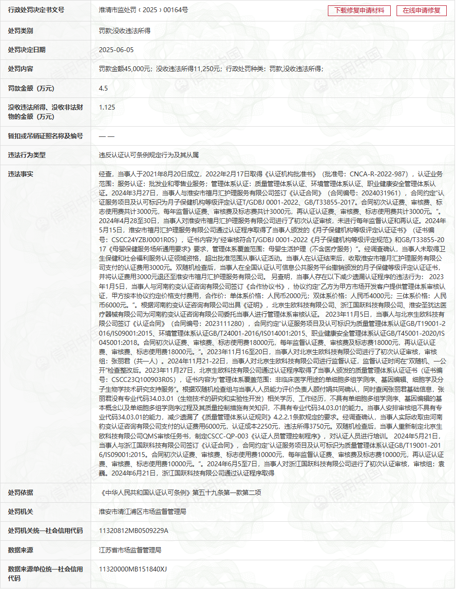 經(jīng)查,當(dāng)事人于2021年8月20日成立,2022年2月17日取得《認(rèn)證機構(gòu)批準(zhǔn)書》(批準(zhǔn)號:CNCA-R-2022-987),認(rèn)證業(yè)務(wù)范圍:服務(wù)認(rèn)證:批發(fā)業(yè)和零售業(yè)服務(wù);管理體系認(rèn)證:質(zhì)量管理體系認(rèn)證、環(huán)境管理體系認(rèn)證、職業(yè)健康安全管理體系認(rèn)證。2024年3月27日,當(dāng)事人與淮安市禧月匯護(hù)理服務(wù)有限公司簽訂《認(rèn)證合同》(合同編號:2024031961),合同約定“認(rèn)證服務(wù)項目及認(rèn)可標(biāo)識為月子保健機構(gòu)等級評定認(rèn)證T/GDBJ 0001-2022、GB/T33855-2017。合同初次認(rèn)證費、審核費、標(biāo)志使用費共計3000元,每年監(jiān)督認(rèn)證費、審核費及標(biāo)志費共計3000元,再認(rèn)證認(rèn)證費、審核費、標(biāo)志使用費共計3000元。”。2024年4月28至30日,當(dāng)事人對淮安市禧月匯護(hù)理服務(wù)有限公司進(jìn)行了初次認(rèn)證審核,未進(jìn)行每年監(jiān)督認(rèn)證和再認(rèn)證。2024年5月15日,淮安市禧月匯護(hù)理服務(wù)有限公司通過認(rèn)證程序取得了當(dāng)事人頒發(fā)的《月子保健機構(gòu)等級評定認(rèn)證證書》(證書編號:CSCC24YZBJ0001R0S),證書內(nèi)容為“經(jīng)審核符合T/GDBJ 0001-2022《月子保健機構(gòu)等級評定規(guī)范》和GB/T33855-2017《母嬰保健服務(wù)場所通用要求》要求,管理體系覆蓋范圍:母嬰生活護(hù)理(不含醫(yī)療服務(wù))”。經(jīng)調(diào)查確認(rèn),當(dāng)事人未取得衛(wèi)生保健和社會福利服務(wù)認(rèn)證領(lǐng)域資格,超出批準(zhǔn)范圍從事認(rèn)證活動。當(dāng)事人在認(rèn)證結(jié)束后,收取淮安市禧月匯護(hù)理服務(wù)有限公司支付的認(rèn)證費用3000元。雙隨機檢查后,當(dāng)事人在全國認(rèn)證認(rèn)可信息公共服務(wù)平臺撤銷頒發(fā)的月子保健等級評定認(rèn)證證書,并將認(rèn)證費用3000元退還至淮安市禧月匯護(hù)理服務(wù)有限公司。 另查明,當(dāng)事人存在以下減少遺漏認(rèn)證程序的違法行為: 2023年1月5日,當(dāng)事人與河南豹變認(rèn)證咨詢有限公司簽訂《合作協(xié)議書》,協(xié)議約定“乙方為甲方市場開發(fā)客戶提供管理體系審核認(rèn)證,甲方按本協(xié)議約定價格支付費用,合作價:單體系價格:人民幣2000元;雙體系價格:人民幣4000元;三體系價格:人民幣6000元。”。根據(jù)河南豹變認(rèn)證咨詢有限公司出具《證明》,北京生歐科技有限公司、浙江國躍科技有限公司、淮安圣猶達(dá)醫(yī)療器械有限公司為河南豹變認(rèn)證咨詢有限公司委托當(dāng)事人進(jìn)行管理體系審核認(rèn)證。 2023年11月5日,當(dāng)事人與北京生歐科技有限公司簽訂《認(rèn)證合同》(合同編號:2023111280),合同約定“認(rèn)證服務(wù)項目及認(rèn)可標(biāo)識為質(zhì)量管理體系認(rèn)證GB/T19001-2016/IS09001:2015、環(huán)境管理體系認(rèn)證GB/T24001-2016/IS014001:2015、職業(yè)健康安全管理體系認(rèn)證GB/T45001-2020/IS045001:2018。合同初次認(rèn)證費、審核費、標(biāo)志使用費18000元,每年監(jiān)督認(rèn)證費、審核費及標(biāo)志費18000元,再認(rèn)證認(rèn)證費、審核費、標(biāo)志使用費18000元。”。2023年11月16至20日,當(dāng)事人對北京生歐科技有限公司進(jìn)行了初次認(rèn)證審核,審核組:張麗君(共一人)。2024年11月21-22日,當(dāng)事人對北京生歐科技有限公司進(jìn)行監(jiān)督認(rèn)證,監(jiān)督認(rèn)證時間在“雙隨機、一公開”檢查整改后。2023年11月27日,北京生歐科技有限公司通過認(rèn)證程序取得了當(dāng)事人頒發(fā)的質(zhì)量管理體系認(rèn)證證書(證書編號:CSCC23Q100903R0S),證書內(nèi)容為“管理體系覆蓋范圍:非臨床醫(yī)學(xué)用途的單細(xì)胞多組學(xué)測序、基因編輯、細(xì)胞學(xué)及分子生物學(xué)技術(shù)研究支持服務(wù)”。根據(jù)雙隨機檢查組與當(dāng)事人人員能力評價負(fù)責(zé)人顧付娟共同確認(rèn),同時查閱張麗君基礎(chǔ)信息,張麗君沒有專業(yè)代碼34.03.01(生物技術(shù)的研究和實驗性開發(fā))相關(guān)學(xué)歷、工作經(jīng)歷,不具有單細(xì)胞多組學(xué)測序、基因編輯的基本概念以及單細(xì)胞多組學(xué)測序過程及其質(zhì)量控制措施有關(guān)知識,不具有專業(yè)代碼34.03.01的能力。當(dāng)事人安排審核組不具有專業(yè)代碼34.03.01的能力,減少遺漏了《質(zhì)量管理體系認(rèn)證規(guī)則》4.2.2.1條款規(guī)定的要求。經(jīng)調(diào)查確認(rèn),當(dāng)事人實際收取由河南豹變認(rèn)證咨詢有限公司支付的認(rèn)證費用6000元,認(rèn)證成本2250元,違法所得3750元。雙隨機檢查后,當(dāng)事人重新制定北京生歐科技有限公司QMS審核任務(wù)書,制定CSCC-QP-003《認(rèn)證人員管理控制程序》,對認(rèn)證人員進(jìn)行培訓(xùn)。 2024年5月21日,當(dāng)事人與浙江國躍科技有限公司簽訂《認(rèn)證合同》,合同約定“認(rèn)證服務(wù)項目及認(rèn)可標(biāo)識為質(zhì)量管理體系認(rèn)證GB/T19001-2016/IS09001:2015。合同初次認(rèn)證費、審核費、標(biāo)志使用費10000元,每年監(jiān)督認(rèn)證費、審核費及標(biāo)志費10000元,再認(rèn)證認(rèn)證費、審核費、標(biāo)志使用費10000元。”。2024年6月5至7日,當(dāng)事人對浙江國