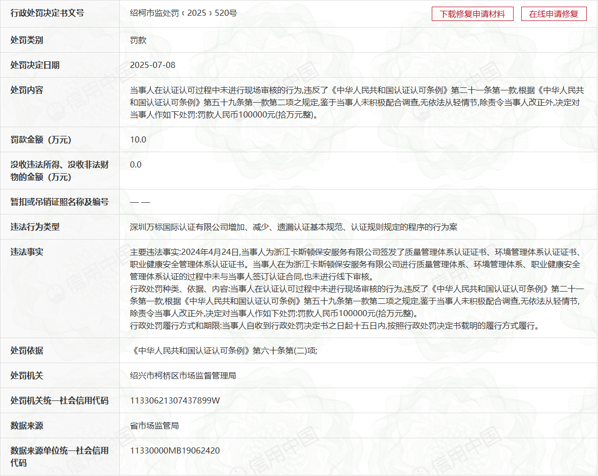 處罰結果: 深圳萬標國際認證有限公司增加、減少、遺漏認證基本規范、認證規則規定的程序的行為案