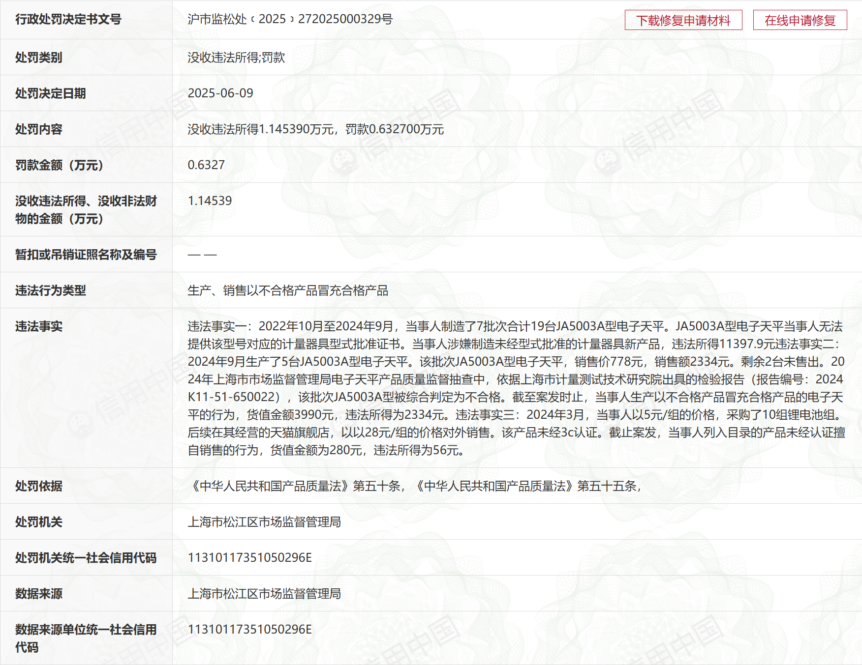 違法事實一:2022年10月至2024年9月,當事人制造了7批次合計19臺JA5003A型電子天平。JA5003A型電子天平當事人無法提供該型號對應的計量器具型式批準證書。當事人涉嫌制造未經型式批準的計量器具新產品,違法所得11397.9元違法事實二:2024年9月生產了5臺JA5003A型電子天平。該批次JA5003A型電子天平,銷售價778元,銷售額2334元。剩余2臺未售出。2024年上海市市場監督管理局電子天平產品質量監督抽查中,依據上海市計量測試技術研究院出具的檢驗報告(報告編號:2024K11-51-650022),該批次JA5003A型被綜合判定為不合格。截至案發時止,當事人生產以不合格產品冒充合格產品的電子天平的行為,貨值金額3990元,違法所得為2334元。違法事實三:2024年3月,當事人以5元/組的價格,采購了10組鋰電池組。后續在其經營的天貓旗艦店,以以28元/組的價格對外銷售。該產品未經3c認證。截止案發,當事人列入目錄的產品未經認證擅自銷售的行為,貨值金額為280元,違法所得為56元。